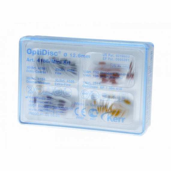 OptiDisc® Mini Kit 12.6mm (120 pcs) Contents: ø 12.6mm: 30 x extra-coarse; 30 x coarse; 30 x fine; 30 x extra-fine; 3 x standard mandrels; 2 x short mandrels; 1 x OptiShine |